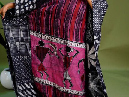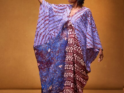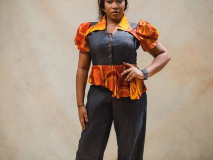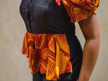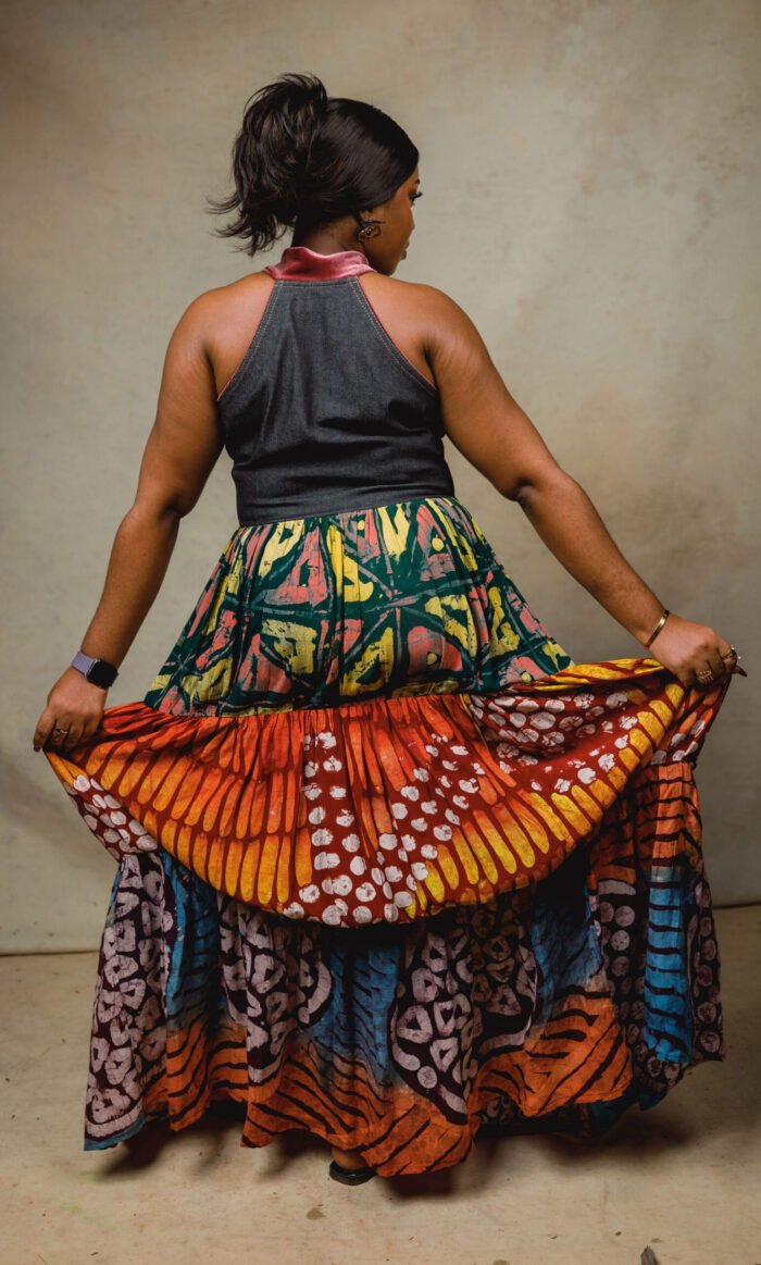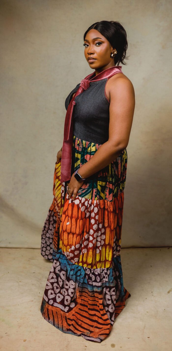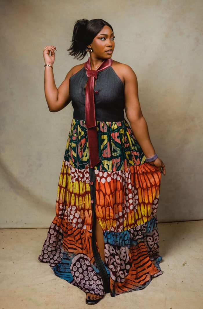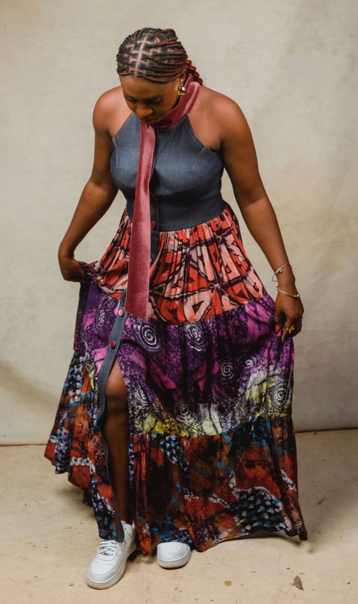 Sleeveless Denim and Adire gypsy dress with velvet details