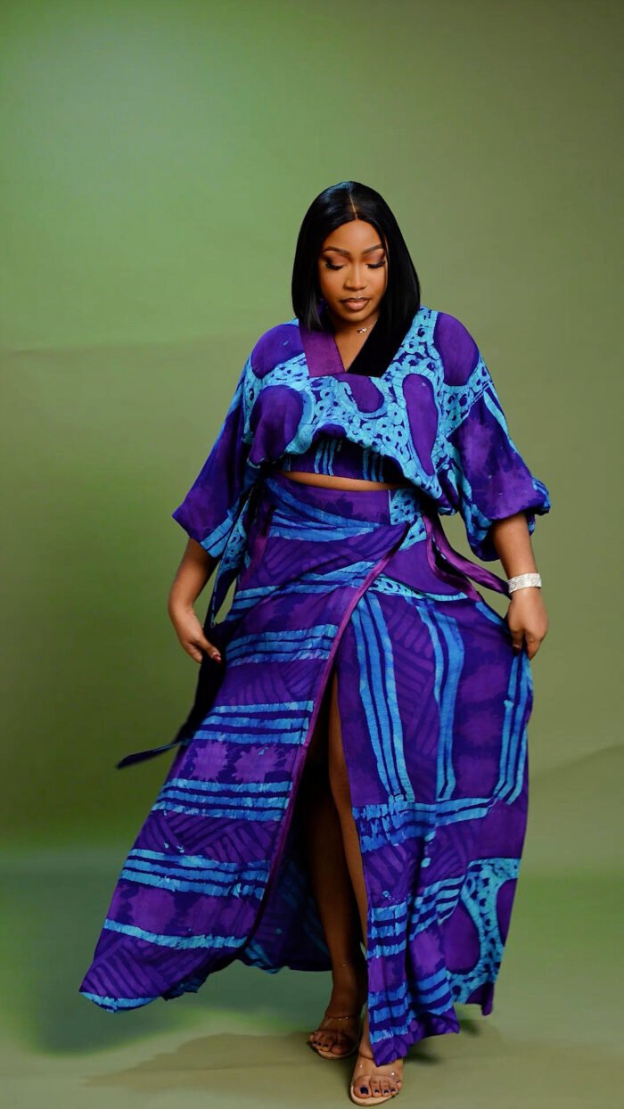 Adire mixed with a velvet crop top and wrap skirt set. For your very own Feminine luxury